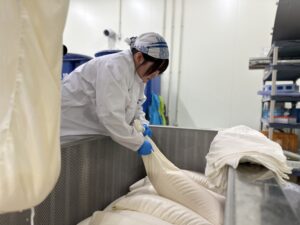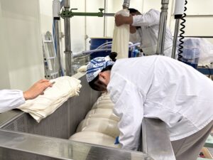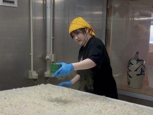 そして、実際に北村茉倫アナウンサーとともに酒質から仕込計画、麹造り、仕込み、上槽、瓶詰めを行いました。